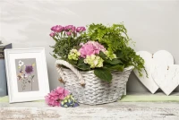 Die Bauernhortensie (Hydrangea macrophylla) ist ein buschiger, aufrechter Kleinstrauch, der rosafarbene, schalenförmige, in Dolden angeordnete Blüten hervorbringt. Sie erscheinen von Juni bis September. An einem halbschattigen bis schattigen Standort mit humosem Boden erreicht sie gewöhnlich eine Höhe von ca. 1,5 m und wird ca. 1,5 m breit.