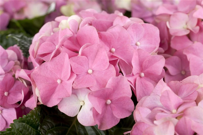 Die rosafarbenen, schalenförmigen Blüten der Bauernhortensie erscheinen in Dolden von Juni bis September.