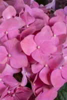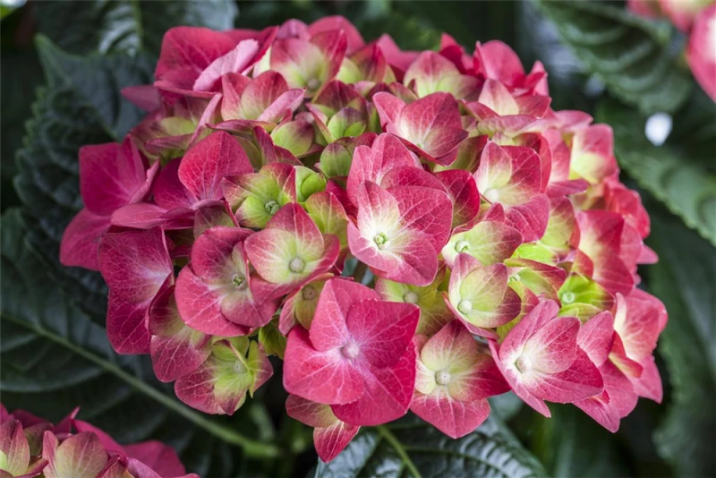 Die roten, schalenförmigen Blüten der Bauernhortensie erscheinen in Dolden von Juni bis September.