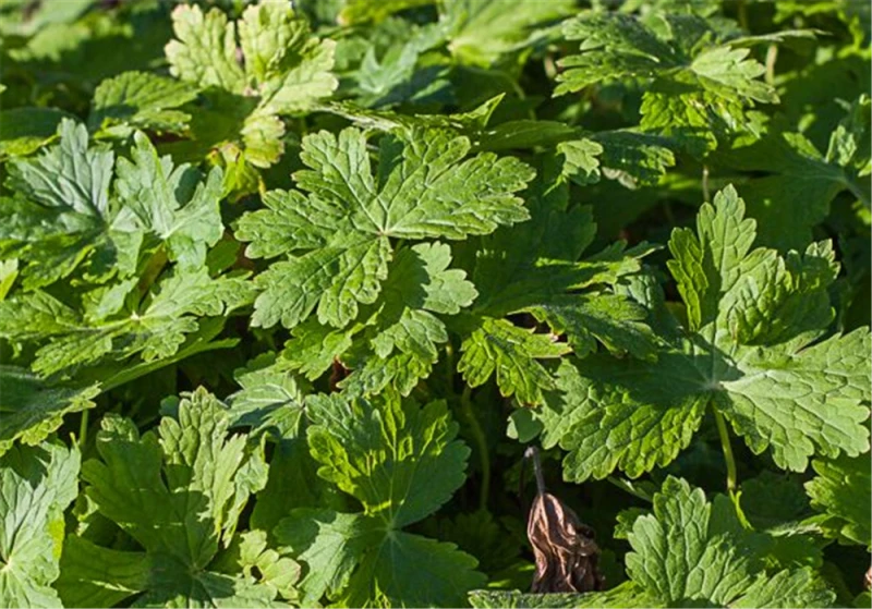 Hoher Blattschmuckwert. Die sommergrünen Blätter des Braunen Garten-Storchschnabels ‚Raven‘ sind hellgrün, rundlich, gelappt.