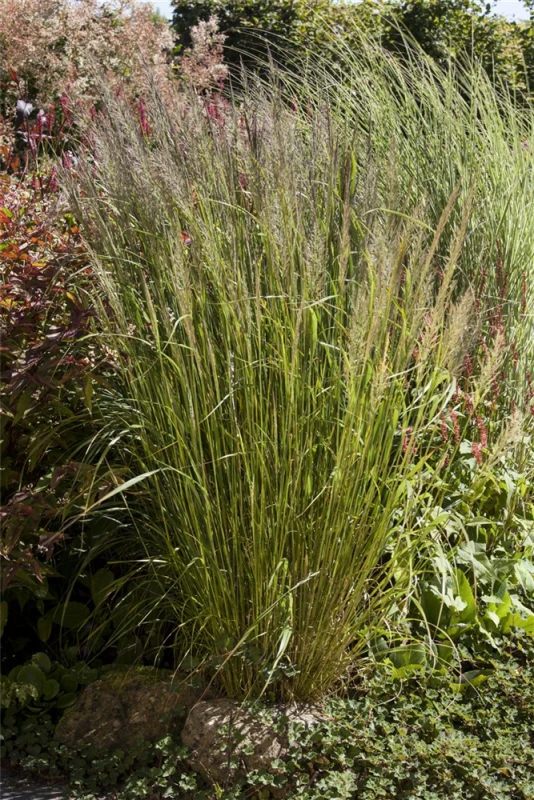 Das Diamant-Reitgras (Calamagrostis brachytricha) ist mit seiner hellgrünen Blattfärbung ein dekoratives Gestaltungselement im Garten, welches sich an einem sonnigen bis halbschattigen Standort mit einem möglichst durchlässigen, kalkhaltigen, nährstoffreichen Boden am wohlsten fühlt. Die hellrosafarbenen Blütenwedel schmücken die aufrecht und überhängend wachsende Pflanze ab Sommer. Bei günstigen Bedingungen erreicht dieses winterharte Gras eine Höhe von ca. 1 m und wird bis zu 80 cm breit.
