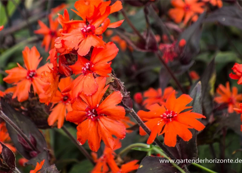 Die Garten-Bastard-Lichtnelke (Lychnis arkwrightii) ist eine aufrechte, kompakte Staude mit dekorativen, lanzettlichen, dunkelroten Blättern. An einem sonnigen Standort mit durchlässigem, kalkfreiem, nährstoffreichem Boden erreicht sie gewöhnlich eine Höhe von ca. 20 cm und wird ca. 20 cm breit. Die Garten-Bastard-Lichtnelke ist gut frostverträglich.