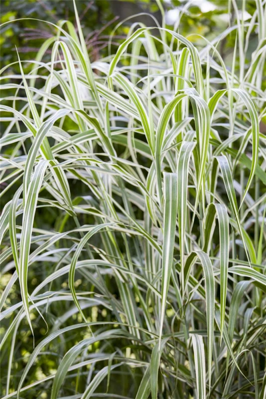 Die sommergrünen Blätter des Garten-Chinaschilfs ‚Cosmopolitan‘ sind grün-weiß, lineal.