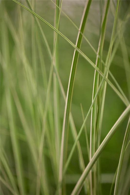 Die sommergrünen Blätter des Garten-Chinaschilfs ‚Kleine Silberspinne‘ sind mittelgrün, lineal.