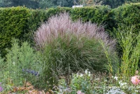 Die silbrigen Blüten des Garten-Chinaschilf ‚Kleine Silberspinne‘ erscheinen in Rispen von August bis September.