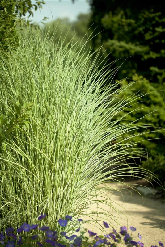 Das Garten-Chinaschilf ‚Morning Light‘ (Miscanthus sinensis) ist mit seiner grün-weißen Blattfärbung ein dekoratives Gestaltungselement im Garten, welches sich an einem sonnigen bis halbschattigen Standort mit einem möglichst durchlässigen, humosen, nährstoffreichen Boden am wohlsten fühlt. Die silbrigen Blütenwedel schmücken die aufrecht und horstbildend wachsende Pflanze ab Herbst. Bei günstigen Bedingungen erreicht dieses winterharte Gras eine Höhe von ca. 1,2 m und wird bis zu 80 cm breit.