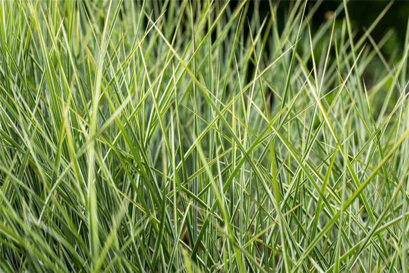 Hoher Blattschmuckwert. Die sommergrünen Blätter des Garten-Chinaschilfs ‚Morning Light‘ sind grün-weiß, lineal.