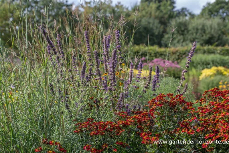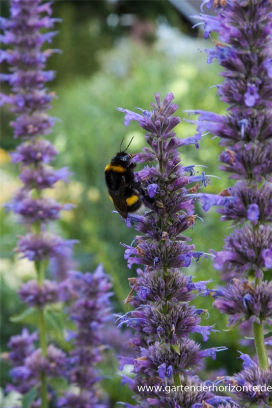 Agastache rugosa ‚Serpentine‘ bildet lippenförmige, in Ähren angeordnete, dunkellilafarbene Blüten ab Juni. Diese verströmen einen angenehmen Duft.