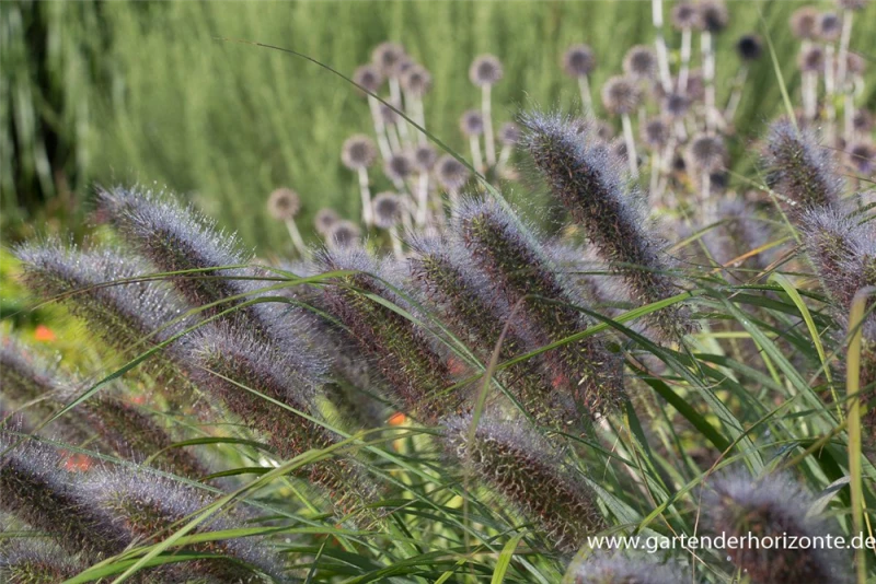 Das Garten-Federborstengras ‚Red Head‘ (Pennisetum alopecuroides) ist mit seiner mittelgrünen Blattfärbung ein dekoratives Gestaltungselement im Garten, welches sich an einem sonnigen Standort mit einem möglichst durchlässigen, nährstoffreichen Boden am wohlsten fühlt. Die roten Blütenwedel schmücken die buschig wachsende Pflanze ab Sommer. Bei günstigen Bedingungen erreicht dieses winterharte Gras eine Höhe von ca. 60 cm und wird bis zu 80 cm breit.
