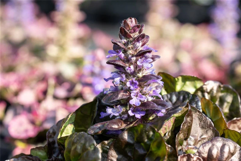 Ajuga reptans ‚Black Scallop’® bildet lippenförmige, in Quirlen angeordnete, violette Blüten ab April.