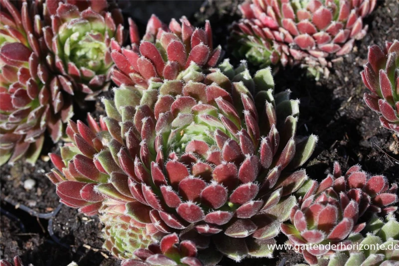 Die immergrünen Blätter der Garten-Hauswurz ‚Hey Hey‘ sind grün-rot, dickfleischig.