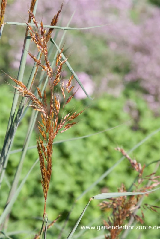 Die rot-braunen Blüten des Garten-Indianergras ‚Indian Steel‘ erscheinen in Rispen von September bis Oktober.