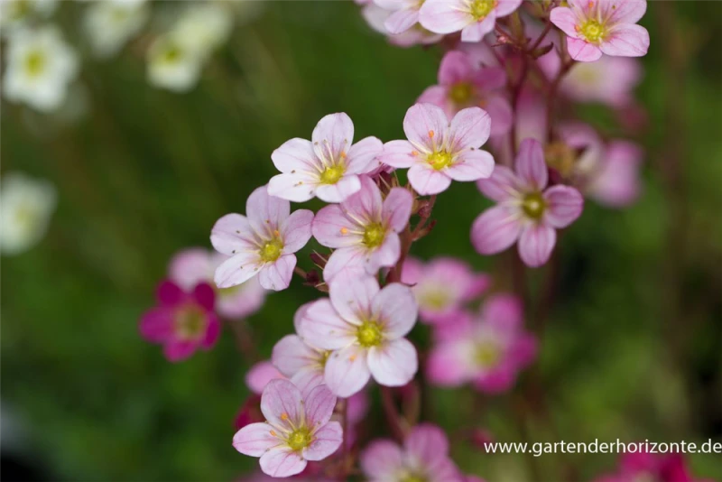 Saxifraga x arendsii ‚Blütenteppich‘ bildet schalenförmige, rosafarbene Blüten ab April.