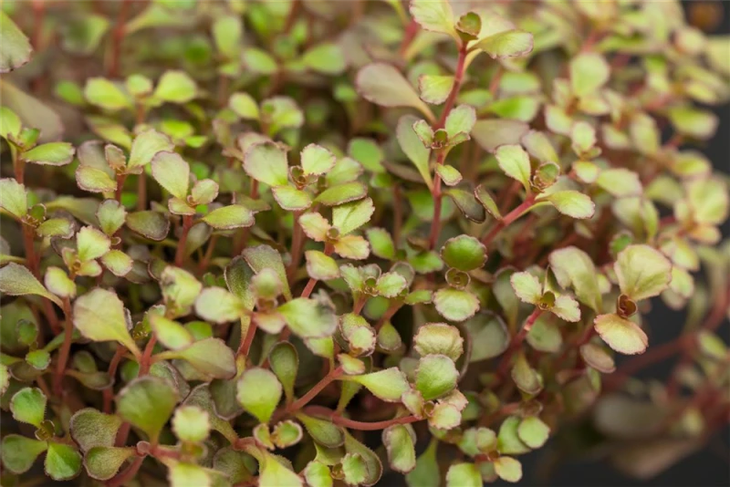 Die wintergrünen Blätter des Garten-Teppich-Fettblatts sind grün-rot, dickfleischig.