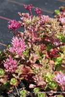 Sedum spurium ‚Voodoo‘ bildet in Dolden angeordnete, rosafarbene Blüten ab Juni.