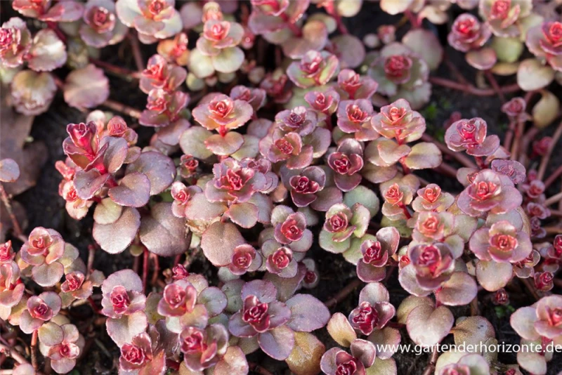 Das Garten-Teppich-Fettblatt (Sedum spurium) ist eine teppichartige wintergrüne Staude, die von Juni bis Juli rosafarbene, in Dolden angeordnete Blüten bildet. An einem sonnigen, windgeschützten Standort mit durchlässigem, nährstoffreichem Boden erreicht es gewöhnlich eine Höhe von ca. 10 cm und wird ca. 20 cm breit. Das Garten-Teppich-Fettblatt ist gut frostverträglich.