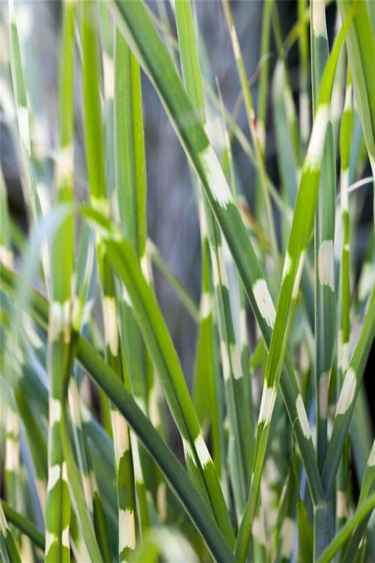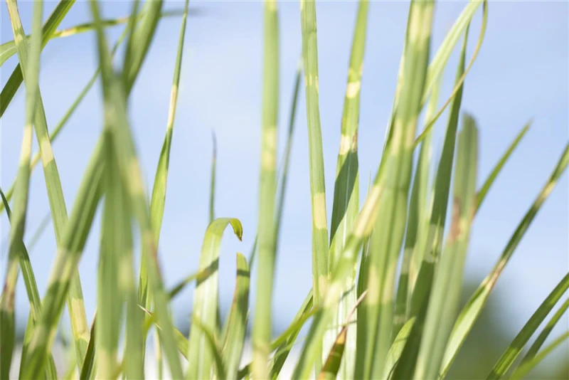 Hoher Blattschmuckwert. Die sommergrünen Blätter des Garten-Zebraschilfs sind gelb-grün, lineal.