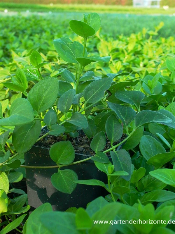 Großblättriges Immergrün ist ein kriechend und mattenbildend wachsender Halbstrauch, der eine Höhe von 30 – 40 cm und eine Breite von 40 – 80 cm erreichen kann.