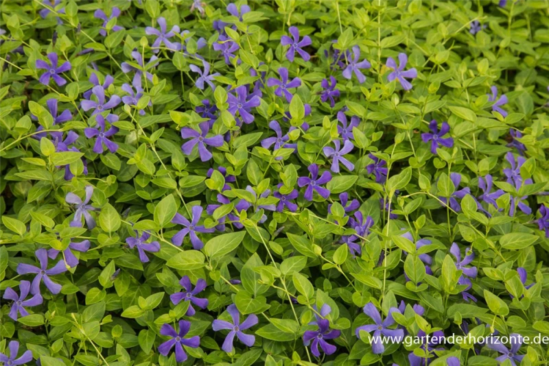 Das Großblättrige Immergrün (Vinca major) ist eine kriechende, mattenbildende immergrüne Staude, die von Mai bis September blauviolette, radförmige Blüten bildet. An einem sonnigen bis schattigen Standort mit durchlässigem, humosem, lockerem, nährstoffreichem Boden erreicht es gewöhnlich eine Höhe von ca. 40 cm und wird ca. 80 cm breit. Das Großblättrige Immergrün ist gut frostverträglich.