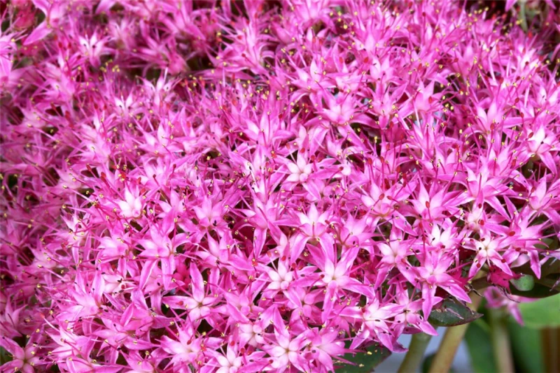 Sedum hybridum ‚Munstead Dark Red‘ bildet in Dolden angeordnete, rot-braune Blüten ab Juli.