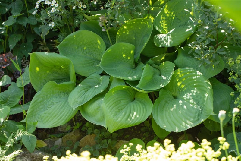 Hoher Blattschmuckwert. Die sommergrünen Blätter der Grünblättrige Riesen-Funkie sind mittelgrün, grundständig, ganzrandig.