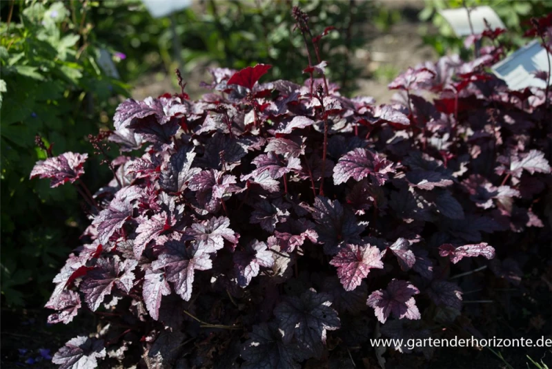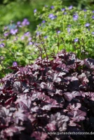 Das Garten-Silberglöckchen ‚Plum Pudding’® (Heuchera micrantha) ist eine buschige, horstbildende wintergrüne Staude mit dekorativen, rundlichen, dunkelroten Blättern. An einem sonnigen bis halbschattigen Standort mit durchlässigem, nährstoffreichem Boden erreicht es gewöhnlich eine Höhe von ca. 45 cm und wird ca. 40 cm breit. Das Garten-Silberglöckchen ‚Plum Pudding’® ist gut frostverträglich.