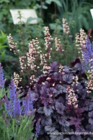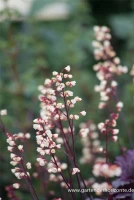 Heuchera micrantha bildet glockenförmige, in Trauben angeordnete, hellrosafarbene Blüten ab Juni.