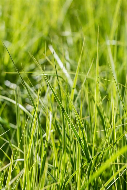 Die sommergrünen Blätter der Garten-Palmwedel-Segge ‚Silberstreif‘ sind weißbunt.