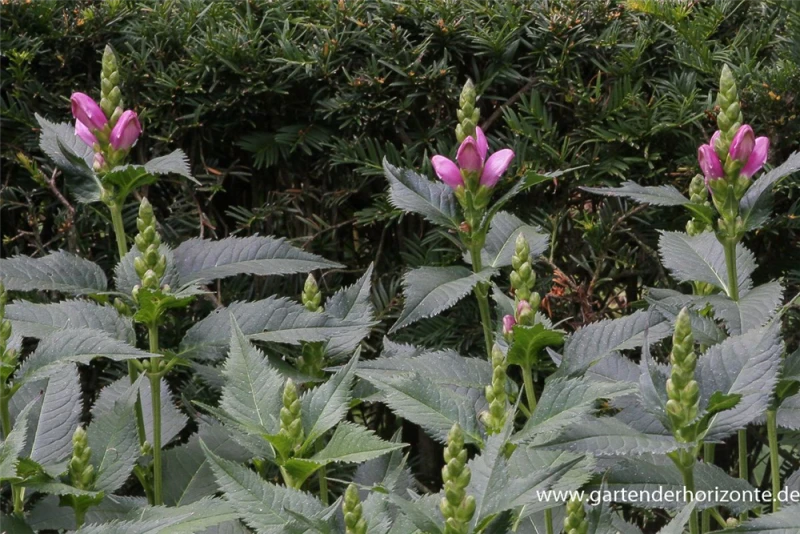 Chelone obliqua bildet rachenförmige, rosafarbene Blüten ab August.